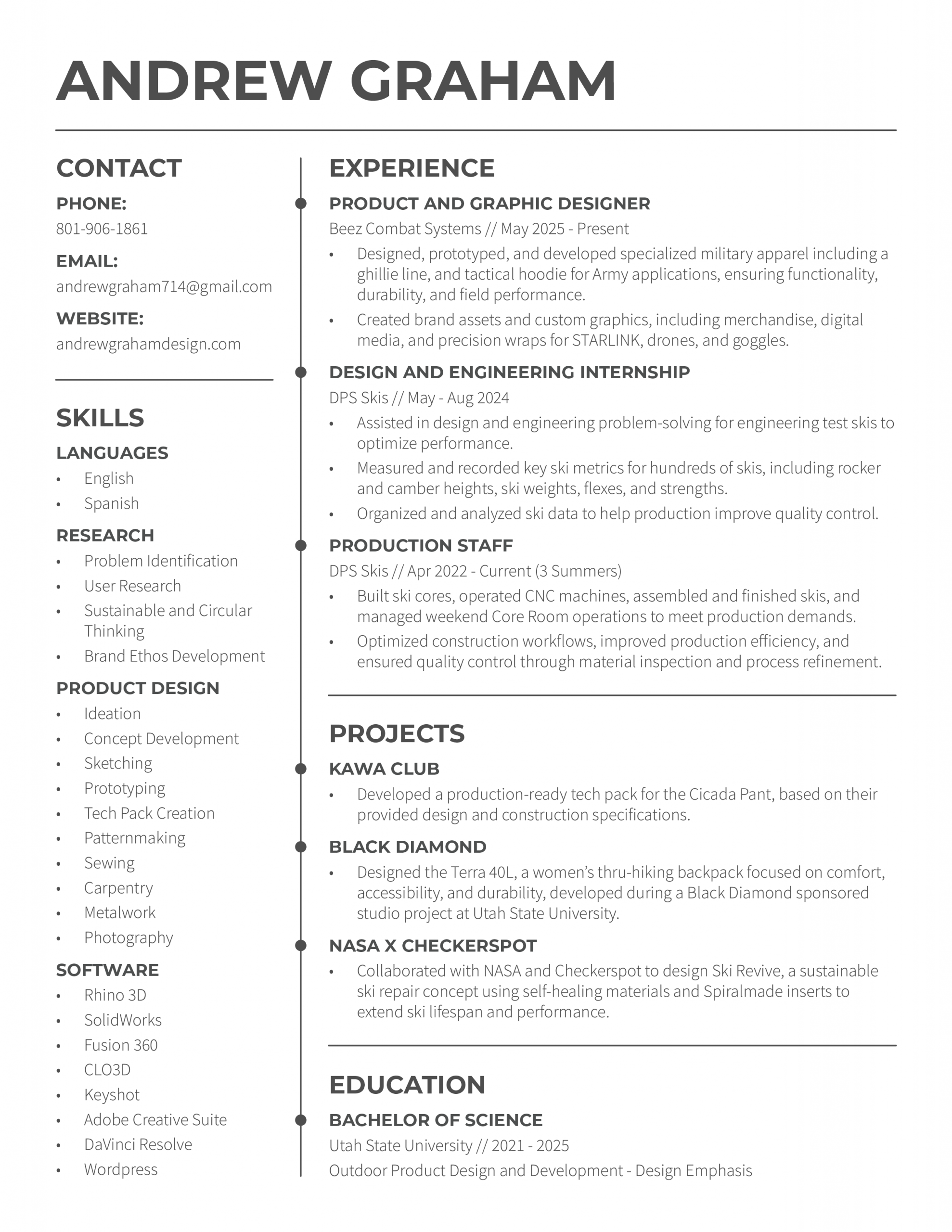 Andrew Graham is a designer, adventurer, and graduate of Utah State University, where he earned a Bachelor of Science in Outdoor Product Design in 2025. Born and raised in Salt Lake City, Utah, Andrew developed a deep connection to the outdoors at an early age, particularly through skiing, mountain biking, and hiking. Of all his hobbies, skiing has been his greatest passion and source of inspiration. For Andrew, few experiences compare to skiing in the mountains after a fresh storm; it’s an environment that pushes his physical limits and demands complete mental focus.